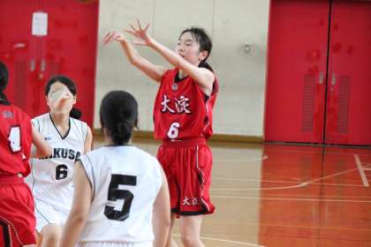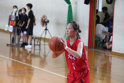 第2Pで大爆発します。ゲームメイクのMさん(1−3)の効果的なパスが次々と決まります。メンバー交代で入った、Nさん(1−3)やUさん(1−3)も得点を決めるなど、絶好調です。Yさん(2−4)がバスケットカウントのフリースローが決まったときは、笑顔満開。その中でも、キャプテンYさん(2−2)がメンバーを集めて指示するなど、第2Pで一気に点差を開きました。前半を終えて、27−9と大きくリードしました。
