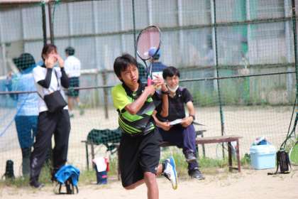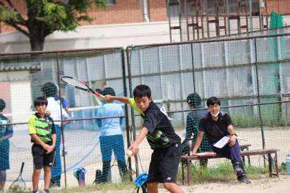 この試合、第5ゲームまで戦う大熱戦となりました。学年代表Oくん(2−3)が強めのストロークで攻め、長いラリーが多く、緊張感のある場面が多い展開となりました。ファイナルゲームをストレートで取り、いい流れをKくん(2−2)Sくん(2−2)にバトンパスします。
