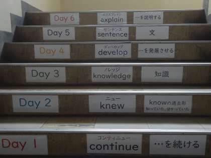 “先生,単語ってどうやって覚えるんですか?”そんな質問に2年生の英語科の先生が,校内で少し工夫をしてみました。単語を覚える方法は,たくさんあるかもしれません。書く,読む,リズム,語源,文や歌でなど。しかし,残念ながらどれも簡単な道ではありません。少しずつ,少しずつ積み上げていくしかありません。部活動の練習と同じかもしれませんね。毎日積み上げていたら力がついていたという経験はありませんか?この2年生の階段英単語は,積み上げにピッタリの取り組みです。英語に出会うこと触れることそして使うことで必ず英語力はアップします。大事なことは,間違えることです。間違いを恐れず英語に向き合ってくれたらうれしいです。さぁ2年生。この階段英単語から単語テストです。単語博士になるのは誰かな?You can do it!
