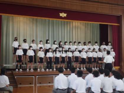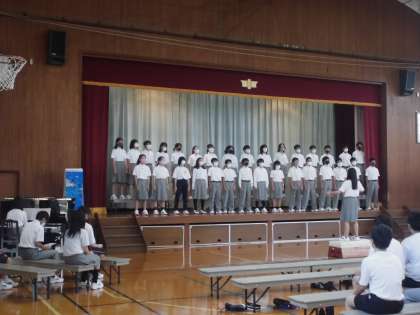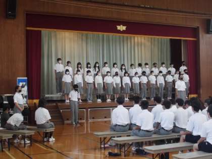 1年生にとってはじめての合唱コンクールでした。リハーサルの時にはまだまだ恥ずかしさや自信のなさが見られていましたが,本番では全員の顔つきがたくましく,そしてクラスでの絆を感じられる姿でした。4組は「大切なもの」3組は「怪獣のバラード」2組は「変わらないもの」を立派に歌ってくれました。歌う姿だけでなく,聴く姿もとても素晴らしくその背中には成長の姿が見えました。結果発表の前,学年主任が「全クラス金賞です」と言っていた通り,どのクラスも感動的な合唱となりました。校長先生の言葉で「合唱が苦手な人もいれば,得意な人もいる。勉強も同じ。これからクラスで苦手なことを得意な人が教えてカバーし合えたらいいですね」とおっしゃってました。1年生の学年目標である「人の心の痛みが分かる人になってほしい」に一歩近づけた合唱取組でした。4組のみなさん,金賞おめでとう!!