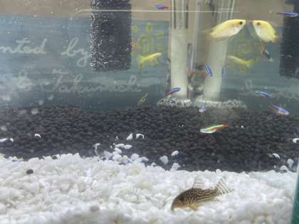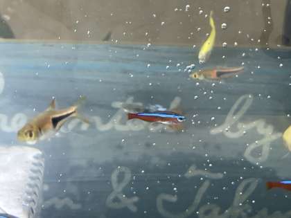 1年生のフロアーにネオンテトラ,ラスボラエスペイ,ゴールデンハニードワーフグラミー,コリドラス,グッピーがやってきました。決して恐竜ではありません。熱帯魚です。朝からの水合せを経て生徒の手で水槽に移動しました。色とりどりのきれいな熱帯魚が元気に泳いでいます。1年生のみんなもとてもうれしそうです。自分たちが生徒総会で提案したことが実現しましたね。生き物を飼育することはとても大変なことです。大切に命を育てることを1年生みんなで考えられたらいいですね。