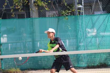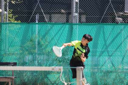 大淀中で2番目のランクであるKくん(2−2)・Sくん(2−2)の1回戦の模様です。この試合、相手ペアとの一進一退の好ゲームとなりました。Kくん(2−2)のリターンが冴え渡りますが、相手ペアも粘ります。ファイナルゲームにもつれた試合は、デュースでもなかなか決着がつきません。4−0とリードするも、相手ペアに追いつかれる展開です。最後は9−7で粘り勝ちして2回戦へと駒を進めました。