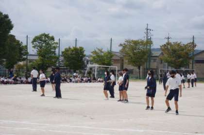 晴天の下、少し爽やかな風が吹いてきました。久しぶりに全校生徒が集まり、体育大会の予行練習をしています。4時間目は、開会式と閉会式の練習が中心です。最後は、体育委員が全校生徒の前で準備体操のお手本を見せてくれました。この準備体操は、3年生女子の体育委員が曲選びから振り付けまですべてオリジナルで考えてくれたようです。本番は、全校生徒で行います。懐かしい曲にきっと参観者も楽しんでくれると思います。ご期待ください。