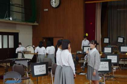 吹奏楽部が円陣を組んでかけ声をかけています。開場しました。3年生10名にとっては最後の大きな舞台になります。3−4Mさんに今の心境を聞くと“めちゃくちゃドキドキしています”とのことです。吹奏楽部のみなさん、今までやってきたことを信じて全力でファイト!
