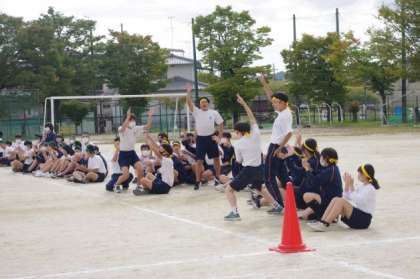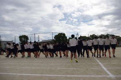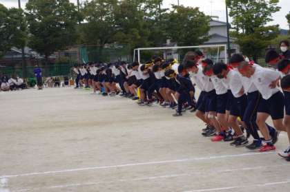 3年生の学年種目は30人31脚です。3年生の先生方がみんなの成長に感動していました。この種目をスタートしたときは、一歩も前に進めなかったようですね。それが、クラス全員でかけ声をかけながら一歩一歩前に進む姿は、見る人を感動させました。たとえ失敗しても最後までやりきる姿は、必ず1年生2年生の心に残っていると思います。ナイスランです。