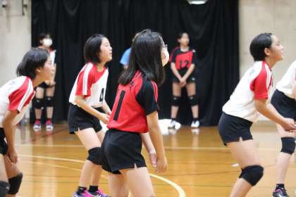 1回戦は、京都京北小中学と西院中学の合同チームとの対戦でした。第1セット、緊張のためか相手サーブで崩されます。Mさん(2−3)の元気で味方を励ましますが、序盤から6−14とリードされます。Kさん(2−2)のブロックが決まるなど懸命に守りますが、12−25で第1セットを取られました。