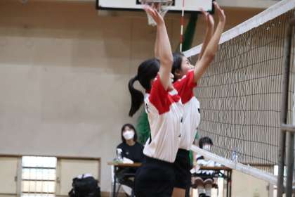 11−7とリードした大淀中ですが、Tさん(2−2)のアタックがネットにかかるなどミスが重なり13−13と追いつかれます。そこからサーブで崩され13−16。しかし、Kさん(2−2)のアタックが連続して決まるなど21−21と追いつきます。ムードメーカーのNさん(2−2)が「落ちついてー」と声をかけます。再びリードを奪われますが、Tさん(2−2)のサーブで24−24と土壇場でデュースに持ち込みます。しかし、ここでもサーブで崩されて24−26と惜しくもセットを失いました。