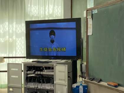26日に行われる生徒会選挙に向けて、今日の昼休みに立候補者からの政見放送が行われました。選挙管理委員長からの全校放送のあと、各クラスのテレビ場面で行いました。2年生の皆さんにとって、これからの大淀中学校を担っていく時が近づいてきました。才能あふれる2年生。君たちの活躍が楽しみです。