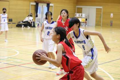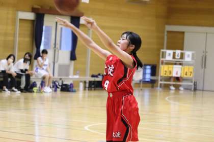 ハーフタイム。相手エースを止めるためにディフェンスの確認をします。センターNさん(1−3)を中心に得点を重ねますが、オフェンスの中心であるMさん(1−3)が相手校にマークされて思うようにパスが出せません。外からの攻撃が多くなりますが、ショット率がなかなか上がってきません。
