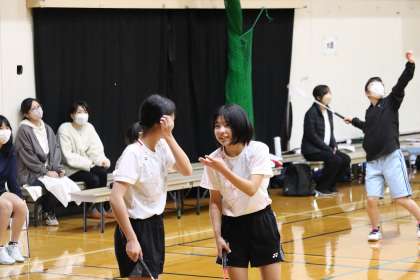 第1ゲーム序盤、相手校のネットプレーに翻弄され7−12とリードされ、その後、Iさんの攻撃的なショットが効果的で、12−12と追いつきます。その後は一進一退の展開で20−20のデュースゲームになりました。しかし、追いついた勢いそのままにYさんのスマッシュで21−20、一度追いつかれますが、相手ペアのミスショットでポイントを奪い、最後はIさん(2−3)のスマッシュが決まり24−22と接戦に勝ちました。