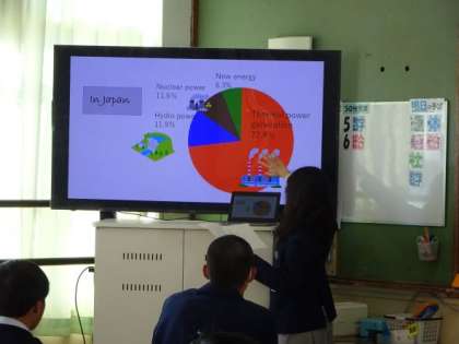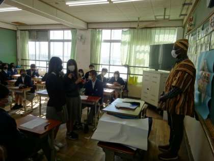 本日3,4時間目に技術・家庭科の中で、異文化交流授業を行いました。2組と5組はアフリカのガーナ出身の長期研修員さんに来ていただき、自己紹介やガーナの文化についてお話していただきました。伝統的なダンスや食べ物について知り、ガーナが抱えている問題であるごみ問題について考え、意見を交流しました。その後、2組はYさん、5組はSさんが家庭科で作成した、エネルギーについての絵本の発表を行いました。研修員さんとの会話や絵本の発表は全て英語でしたが、真剣に聞きながら頷き、堂々と質疑応答している姿が素晴らしかったです。また、授業後には研修員さんから「生徒の皆さんが多くの反応をしてくれて、これまでの中で一番良い時間を過ごせた。」とコメントしていただきました。