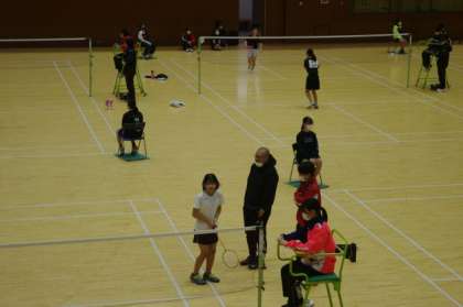 11月26日土曜日島津アリーナで京都市中学校秋季新人大会バドミントン競技全市決勝大会個人の部が行われました。大淀中学校からは個人3人とダブルス2ペアが出場しました。まずは、2年3組Iさんの個人の部です。少し緊張もあったのか最初はサーブに苦労しているようでしたが、徐々にスマッシュやサイドをねらうショットでリズムをつかみ見事に2−0で勝利して2回戦に進出しました。