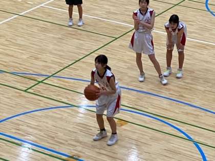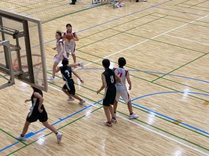 第2P、実力差を感じる展開でした。下京中も攻め込むものの、大淀中のディフェンスが強くパスがうまくつながりません。ショットクロック(24秒以内にシュートを打たなければならないルール)にひっかかっていました。ディフェンスの中心は、キャプテンYさん(2−2)です。今日も光っていました。