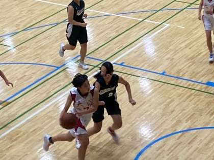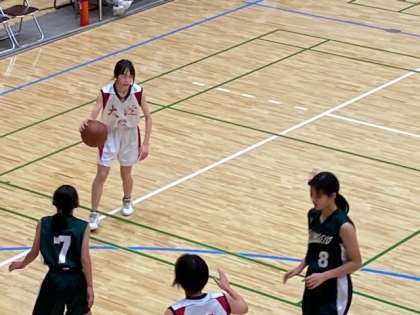 第4Pは、Kさん(1−2)のショットでスタート。第4Pも、ずっと大淀中ペースで試合が進みます。Uさん(1−3)がフリーの位置から確実に決め、残り2分Kさん(1−2)とSさん(1−2)がコートに立ちます。Kさん(1−2)は、ポジショニングが上手で立て続けにシュートを決めます。1年生に新しい力が加わった感じがしました。