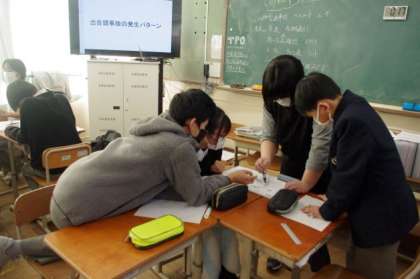 自転車安全教室を各教室で行いました。ビデオを参考にした後にグループになって小型交差点と大型交差点と出合い頭事故のパターンを淀の地域の地図を見ながら真剣に話し合っています。仲間と確認し意識することが大切だと思います。自分の体を守る自転車の乗り方について,そして人を傷つけない自転車の乗り方について話し合うことが出来ました。
