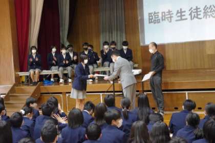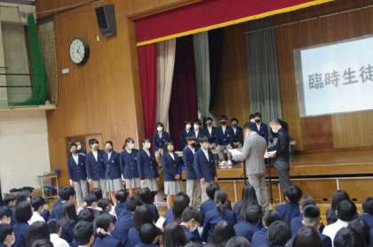 臨時生徒総会の前に、3学期の表彰式を行いました。今までは、オンラインで画面越しの表彰式でしたが今回は全校生徒の前での表彰式です。先日開催された、京都府中学生柔道体重別選手権大会や京都新聞書き初め展と京都市中学校国語研究会書き初め展の表彰がありました。皆さんの今後の更なる活躍を期待しています。
