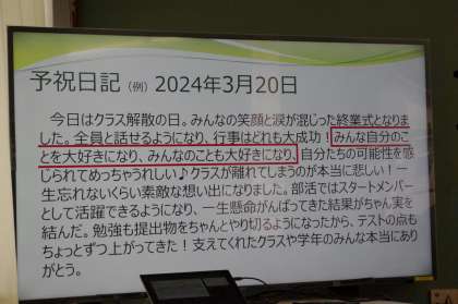 2年生が、2024年3月20日の自分の姿を作文しています。実は、このテーマは、教職員の研修で春休みに同じことをして、発表しました。新しく出会うみんなへ、新しく出会うクラスや学年に教職員の皆さんも熱い想いを語り合いました。今日は、2年生が作文をして、そのことを達成するために目標を立てて、掲示物になっていくようです。それを見るのが楽しみです。