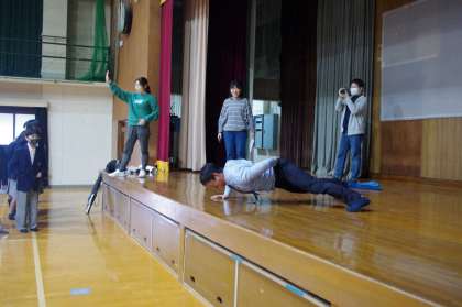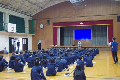 1年生が学年会をしています。2時間構成です。1時間目は、1年生担当の先生方の自己紹介が中心です。先生方は、伝えたいことがいっぱいです。2時間目は、先生方が工夫を凝らしたレクをしてくれています。先生方が登場して○×クイズに大盛り上がり、特に片手で腕立て10回以上は○チームも×チームも全員で先生を応援です。見事に大成功。先生に聞くと余裕ですとのことでした。さすがラガーマンです。終始、和やかな学年会でした。次回からは、徐々に自分たちで司会などをしていくことになるでしょう。