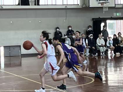 第1Pは、Nさん(2−3)のショットが決まり大淀中が先制しました。事前のデータでは、相手校のデフェンスは前からは来ないと想定していましたが、試合が始まるとボールを運ぶMさん(2−3)に前から激しいチェックが入りました。そのため、パスカットされる場面が多く劣勢に立たされます。しかし、相手校のショットミスに救われ、2−6でスコアが動きません。それでも、開始4分あたりから、相手校のショットが決まりだし徐々に点差がついてきました。大淀中も残り50秒、センターNさん(2−3)の力強いカットインからのシュートで4点目を奪って第1Pが終了します。