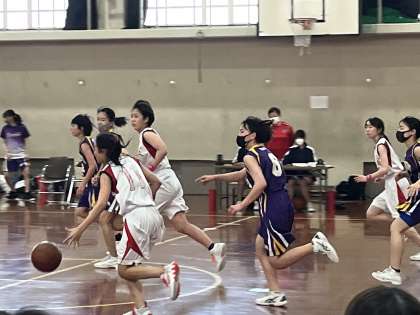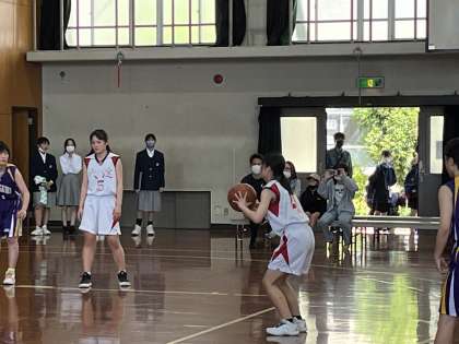 ハーフタイム、思わぬ大差に呆然とする選手が多い中、Yさん(3−4)が第3Pから出場し仲間を奮起します。気合いの入ったディフェンスで試合の流れを変えようと必死です。5分30秒には、Mさん(2−3)が相手のパスをカットしてそのままシュートを決めます。しかし、相手校はドリブルのスピードが速く、相手校のいい所が前面に出てしまいました。