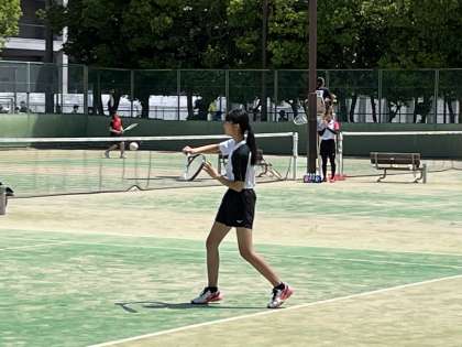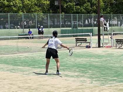 Hさん(3−2)Uさん(3−4)ペアは、大会の第2シード、京都光華中ペアと1回戦を行いました。第2シードのペアが対戦相手となり、苦戦が予想されました。しかし、HさんもUさんも、秋季大会のときより格段に上達していて、ショットのスピード、左右の動きなど、見違えるようなペアに成長していました。
