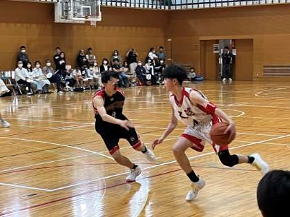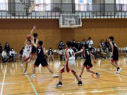 第4ピリオド、Fくん(3−5)の3Pシュートが決まり32−67。ここで、負傷退場していたFくん(3−4)が気迫でコートに戻ります。Fくん(3−4)は、すぐにカットインからのシュートを決めて36−70。Fくん(3−4)が入ると、Fくん(3−5)へのスクリーンプレーもうまく機能し、Fくん(3−5)のシュート成功率も上がりました。Fくん(3−5)の速攻からのパスを受けたCくん(3−5)が落ち着いてシュートを決めて45−72。相手校はここでタイムアウト。その後も攻め込む大淀中ですが、相手校の3Pシュートは最後まで安定していて、点差が詰まりそうで詰まりません。第4Pで差を縮めたものの、51−75で悔しい敗戦となりました。