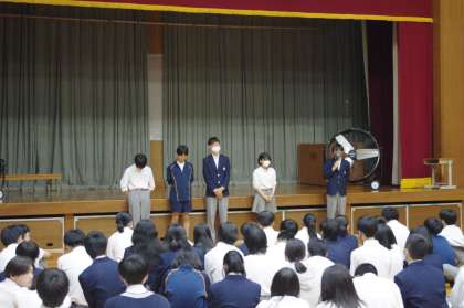 待ちに待った修学旅行が明日からになります。修学旅行が楽しみな様子が事前指導のみんなの笑顔から感じ取れます。スローガン係からも、みんなが笑顔になれる修学旅行にしようという呼びかけもありました。5つの係の代表者からは、たくさんの時間をかけて自分の時間を犠牲にして修学旅行成功に向けて努力してきたことを発表してくれました。最後は、実行委員長から、ルールを守って後悔を残さないように最高で楽しい修学旅行をつくりあげましょう!という力強い言葉もありました。それぞれの発表に対して3年生のみんなから温かい拍手が送られていました。さぁ3年生。いよいよです。体調管理と安全を一番に考えて思いっきり楽しんで来て下さいね!