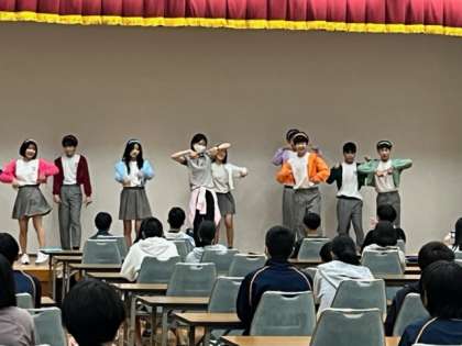 Twiceのメロディーをバックに学年レクが始まりました。途中T先生も登場して、大盛り上がりのスタートです。3ヶ月もかけて練習したようです。ステキでした。
