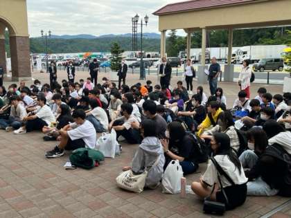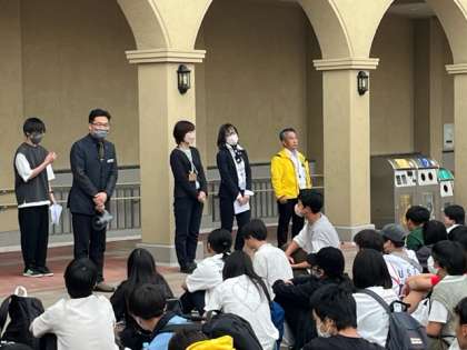 宝塚北サービスエリアに到着しました。解団式が行われ、旅行会社の皆さんや写真屋さんへの御礼が行われています。