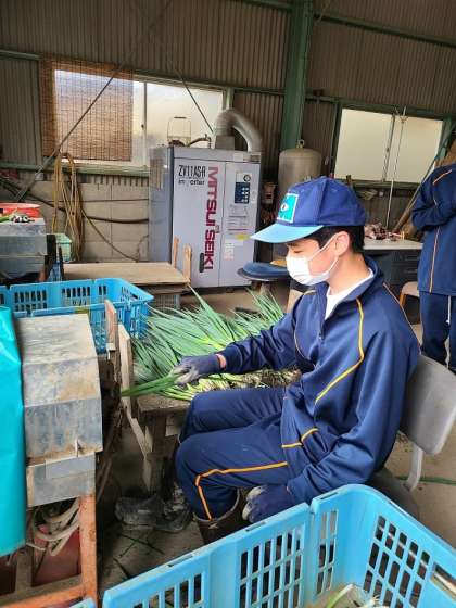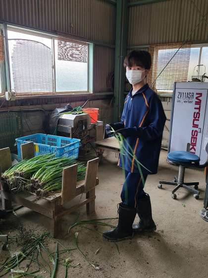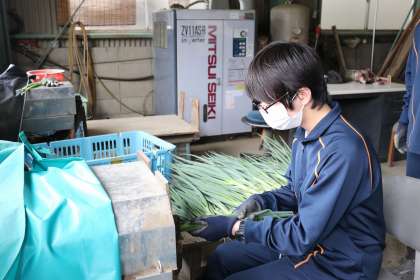 こちらでは,収穫したネギをきれいにする作業を行っています。