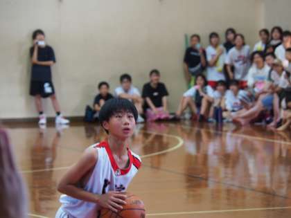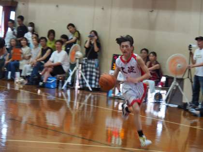 大熱戦となり、試合を終えた女子チームの応援も大きくなっていった第4P。大淀中は暑さの影響かデフェンスで足がまったく動きません。流れは完全に洛水中です。相手のファウルで得たフリースローも外してしまいます。それでも、Fくん(3−5)のミドルゾーンからのシュートが決まりだしました。次第に点差がつまり、残り1分30秒で洛水中がタイムアウト。しかし、流れは大淀中に再び傾きついに再逆転。58−54で向かえた残り1分。途中出場のYくん(2−3)がファウルスローを2本とも決めて60−54。このプレーが試合を決定付けました。最後は、洛水中に得点を許すも60−56の逆転勝利。ディフェンスにかなりの課題を抱えていましたので、2回戦に向けてどのように修正していくのか楽しみです。