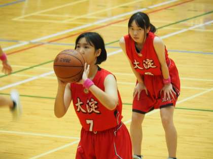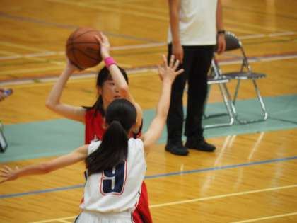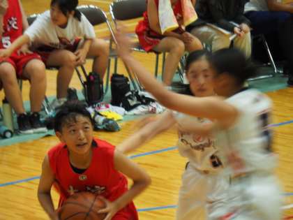 第1Pは、開始20秒センターNさん(2−3)のシュートが決まり、大淀中が先制しました。すぐに逆転されるも、Kさん(1−2)の巧みなステップからのシュートが決まり4−3と逆転します。大淀中は、外からのシュートを中心に攻めますがボールがことごとくリングに弾かれます。対する修学院中は、内からの攻撃で対抗。終了間際に得点を重ねられ4−9で第1Pを終えました。