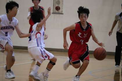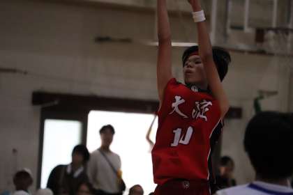 初戦はケガのため欠場していたMさん(2−2)が復帰して、平均身長が高くなった大淀中。開始直後に、Kさん(2−4)のシュートが決まり、その後3Pシュートも決まるなど電光石火でリードした大淀中。その後も、Mさん(2−2)がオフェンスリバウンドを奪ってシュートを決めるなど17−8と幸先のいいスタートでした。