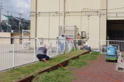 誰一人生徒がいない学校で校内整備などで働いてくださっている方々がいます。まだまだ暑い中,管理用務員さんが花壇の草刈りを汗だくになりながらしていただいています。合唱コンクールから帰ってきたら是非見てください。あれだけあった草がきれいにカットされています。次の行事の体育祭に向けての準備にすでに動いていただいています。また,迷惑をかけている3年4組の皆さん。昨日から明日にかけてエアコン入換え作業を業者の方々がしてくれています。休み明けには,稼働できるかな?楽しみにしていてくださいね。