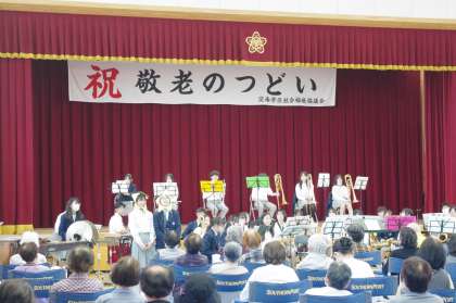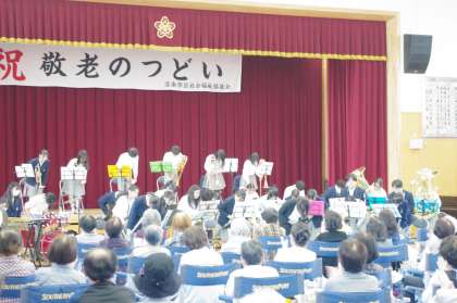 10月15日(日)美豆小学校にて午前中から敬老のつどいが行われました。大勢の方々が参加され和太鼓やダンスそしてカラオケなどで盛り上がっています。大淀中学校からは吹奏楽部が午後の部で演奏します。最初は,アップテンポに学園天国です。次の曲は,演歌特集です。ここでグッと観客の心をつかむとスターファンタジーから銀河鉄道999へとスムーズに演奏が流れていきました。途中,見事なMCと漫才もさすがでした。会場から自然とアンコールが起こり最後はRPGで締めくくりました。会場から大きな拍手をいただき大成功でした。引き続いて来週は,大淀中学校にて音楽の集いです。こちらも楽しみです。たくさんの方々の参観をお待ちしております。
