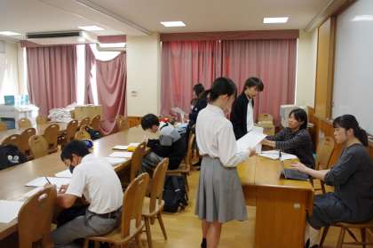 選挙後に交流ルームに各クラスの投票用紙をもって選挙管理委員会が集まっています。今から集計です。事前準備から集計までよく頑張ってくれました。また,選挙管理委員長からの全校放送も見事でした。結果は,明日の朝の予定です。