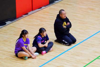 団体戦の決勝トーナメントは、ダブルス戦を2試合、シングルス戦を1試合行います。それぞれ、3セットマッチで2セットとった方の勝利です。1試合目はダブルス戦、2試合目がシングルス戦、3試合目がもう1つのダブルス戦となります。Fさん(2−2)とKさん(2−4)は3試合目の出場となり、1試合目・2試合目の選手が負けてしまうと出場することができません。取材班も、まずは、第3試合までつないで欲しいという気持ちで見ていました。