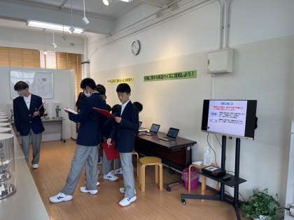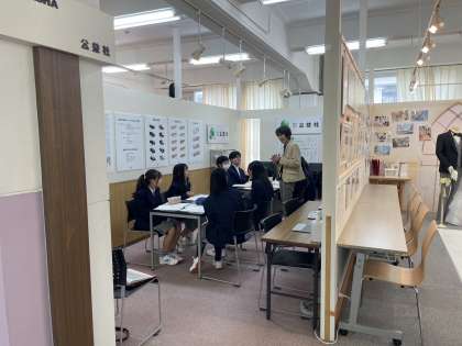 午前中,Bグループの生徒たちは高校や大学卒業前に各企業で就活セミナーを受けているという設定で,企業ごとのブースに分かれて活動しています。ガイダンスルームにはいろいろな展示品や労働に関する用語や働くルールクイズなどもあります。