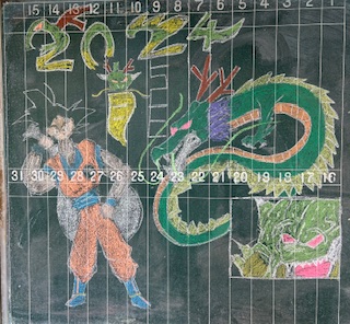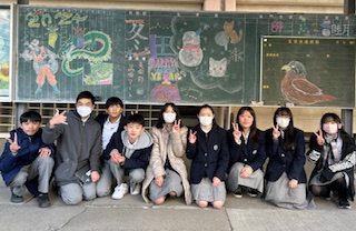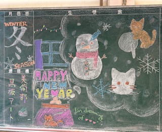 美術部の黒板アート 今回のテーマは「冬」。冬の定番ソング「猫はこたつで丸くなる」と来年の干支「辰」から「龍」を連想したもの。「一富士二鷹三茄子」とパートごとに、それぞれの「冬」を表現しました。今回のアート作成は、極寒の中での作成でした。美術部のみなさん、いつも素敵なアートをありがとう。