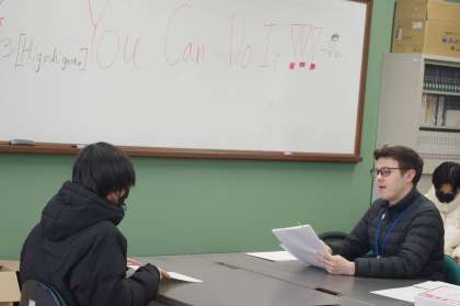 You can do it! ホワイトボードには、ALTの先生からメッセージが書かれています。今日のENGLISH VILLAGEは、英検1次試験を突破した生徒と入学試験で英語面接がある生徒が面接練習をしています。1対1の面接ですが、他の参加者が見学しています。他の人の面接から学べることを目的にしています。面接は練習すればするほど実力と自信がつきます。今日参加できなかった人も、是非 ENGLISH VILLAGEを利用してくださいね。