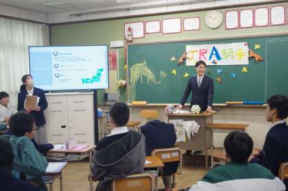 大淀中学校は、日本で一番競馬場に近い学校ではないでしょうか?しかし、現役のJRA騎手と出会う機会はあまりありません。今日は、京都市出身で重賞レースでも勝利経験がある若手のホープ騎手が講演に来てくれました。1年生の生徒の皆さんからの質問も止まりません。ケガをしたことや体重管理や食事制限など自己管理の大切さのお話をしてくださいました。講演後は、将来の夢がジョッキーの生徒が記念撮影をしています。いつの日か、同じレースに出ることがあるといいですね。