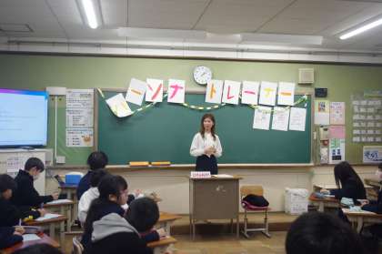 講演者の前には、ON AIRという文字のプレートが置かれています。テレビの一場面を想定しているようです。1年3組の教室には、パーソナルトレーナーとして起業している方のお話です。一般のお客様や日本を代表するアスリートのケアまで幅広く活躍されています。お客様からの感謝の言葉で自分が幸せになり、年齢に関係なく頑張るお客様に元気をもらっているようです。自分の人生をいかに楽しく生きるかをモットーにしているようです。みなさんも大いに刺激を受けているようでした。