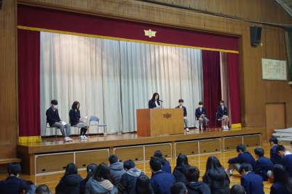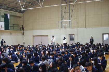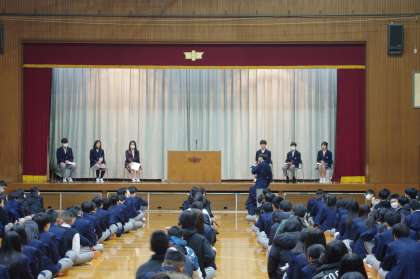 今年度最後のトークイン大淀です。1年生は、“学級に伝えたいこと”2年生は、“学年に伝えたいこと”3年生は、“進路について思うこと、後輩に伝えたいこと”をテーマに自分たちの想いを語っています。6名の発表者の詳細を伝えることはできませんが、みんな素晴らしい発表でした。発表に刺激を受けた人たちの意見交流は今日も活発です。2年生の発表を聞いた1年生は、“進級することに不安があったけど2年生の話を聞いて先輩になることが楽しみになってきました。”3年生の発表を聞いた2年生は、“自分の意見を伝えることの大切さがわかりました。”といった意見がありました。発表したことに、友達・先輩・後輩から意見をもらえる雰囲気が立派な発表につながります。今回のトークイン大淀もしっかりみんなで創り上げました。