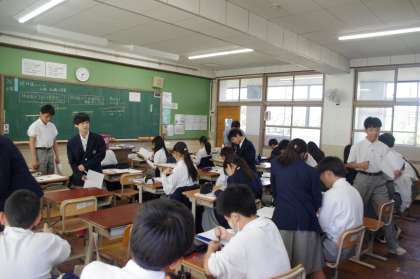 グラウンドを開放しての駐輪場が自転車とバイクでいっぱいです。今年度初めての授業参観にたくさんの保護者の方々が来校していただいています。1年生も2年生も1組さんの教室も人がたくさんです。先生方も緊張の中に気合も入っています。生徒の皆さんの方がリラックスしているようにも見えます。来月には、休日参観もありますのでたくさんの方々に授業を参観していただければ幸いです。