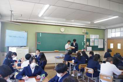 生徒会本部が、1年生の教室で学びの学活についての説明をしています。大淀中学校では支え合って学び合う授業を行っていること、学び合う授業をするためにどんなふうに授業をしているのかなどの説明があります。生徒会本部の生徒が先導して3年生の教室に誘導します。授業見学後もジェンガを使ったプチ劇とパワーポイントでわかりやすく説明してくれています。生徒会本部の皆さん立派な説明ありがとうございました。