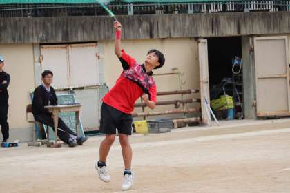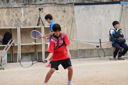 最後に残ったペアでしたので、大淀中の全員が応援する中での試合となりました。第3ゲームをブレイクされましたが、Mさんのストロークが強烈で、相手の厳しいコースに次々と打ち込んでいました。Tさんは正確なショットで、相手のサーブをリターンエースで決めていました。最後の砦は、見事1回戦に勝利しました。