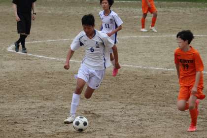引いて守りカウンターで攻撃する大淀中。グラウンドをワイドに使ってパスを中心に責める西陵中という展開で試合が始まりました。攻撃は、10番Sさん(2−3)です。前線から激しいプレスにいくなど運動量の多い選手です。守備の中心は、キャプテンSさん(2−3)です。