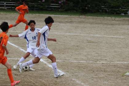開始10分は守備におわれる大淀中でしたが、Sさん(2−3)がプレスで粘って相手ボールを奪います。そのまま左サイドをかけあがりゴール前にセンターリング。そのボールが、相手選手に当たってオウンゴール。1−0で大淀中がリードします。しかし、その後も相手校のペースで試合が進み、12分には抜け出した相手FWとキーパーNさん(2−3)が1対1になるもゴールを割らせません。しかし、その3分後、一瞬の隙を狙われ1−1と試合が振り出しに戻ります。19分には、左CK流れからのボールをGKがはじいたところをシュートされ1−2と逆転されます。そこから、大淀中が反撃に出ます。Nさん(2−2)のスルーパスが随所に見られますが、ゴールにつながりません。27分には、Nさん(2−3)のスローインからのボールをNさん(2−2)がシュートを打つも、GKの正面でした。前半は、1−2西陵中リードで終えます。