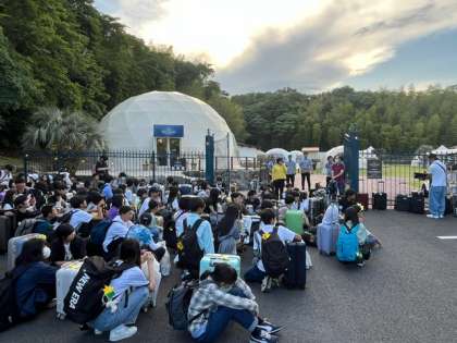 シャボテン公園に別れを告げて、グランピングに到着しました。大淀中学校の貸切です。