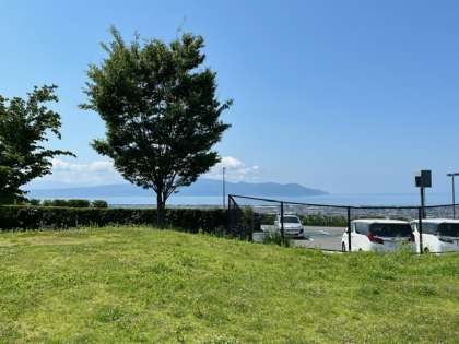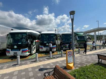 バスは伊豆半島を横断して、新東名高速道路に入り、ラフティング会場に向かっています。駿河湾が見渡せる、駿河湾沼津サービスエリアでトイレ休憩しています。